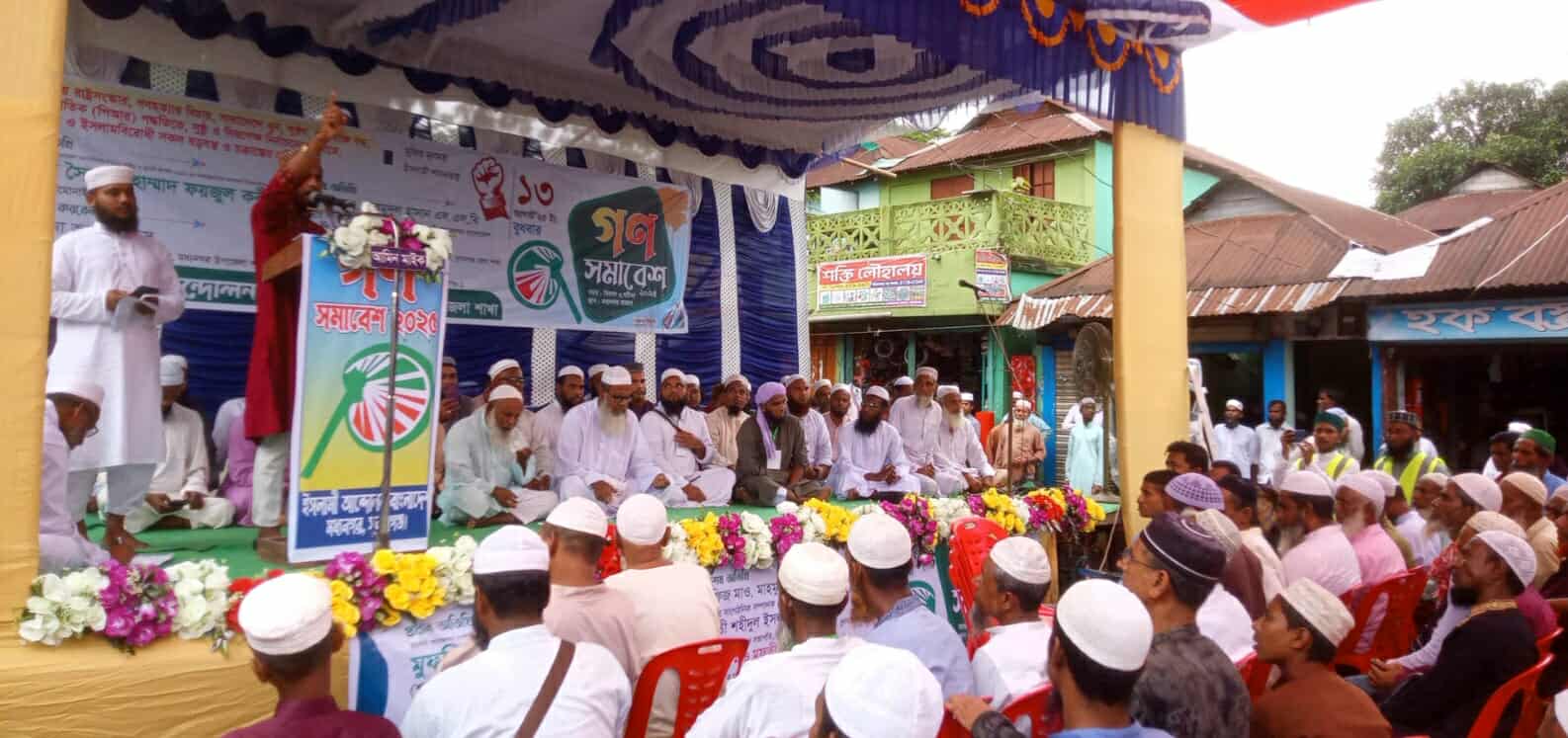 সুনামগঞ্জের নবগঠিত মধ্যনগর উপজেলায় ইসলামী আন্দোলন বাংলাদেশ-এর উদ্যোগে গণ সমাবেশ অনুষ্ঠিত হয়েছে। প্রধান অতিথির বক্তব্যে শায়েখে পীর সাহেব চরমোনাই মুফতি সৈয়দ মোহাম্মদ ফয়জুল করীম বলেন,কৃষক শ্রমিক ও সংখ্যা লঘুদের অধিকার একমাত্র ইসলামি শাসন ব্যবস্থা নিশ্চিত করতে পারে। সুনামগঞ্জের মধ্যনগর উপজেলা সদরে আজ বিকেল ৩টায় ইসলামী আন্দোলন বাংলাদেশ, মধ্যনগর উপজেলা শাখার উদ্যোগে একটি বিশাল গণসমাবেশ অনুষ্ঠিত হয়। সমাবেশে প্রধান অতিথির বক্তব্যে জুলাই আগস্ট বিপ্লবের অন্যতম নেতা ইসলামী আন্দোলন বাংলাদেশ এর নায়েবে আমীর মুফতি সৈয়দ মোহাম্মদ ফয়জুল করীম পীর সাহেব আরো বলেন- প্রয়োজনীয় রাষ্ট্রসংস্কার, গণহত্যার বিচার, আওয়ামী ফ্যাসিবাদের রাজনীতি নিষিদ্ধ সারাদেশে খুন, লুটপাট ও চাঁদাবাজি বন্ধ করে সংখ্যানুপাতিক (পিআর) পদ্ধতিতে সুষ্ঠু ও নিরপেক্ষ নির্বাচনের পরিবেশ সৃষ্টি এবং দেশ ও ইসলাম বিরোধী সকল ষড়যন্ত্র ও চক্রান্তের প্রতিবাদে জনমত গঠনের আহ্বান জানান।সমাবেশে মধ্যনগর উপজেলা ইসলামী আন্দোলনের সভাপতি মাওলানা আব্দুল কুদ্দুস এর সভাপতিত্বে ও উপজেলা ইসলামি ছাত্র আন্দোলনের সভাপতি মামুন হোসেনের সঞ্চালনায় পবিত্র কোরআন তিলাওয়াত করেন হাফেজ জুনাইদ । বিশেষ অতিথি হিসেবে উপস্থিত ছিলেন—কেন্দ্রীয় সাংগঠনিক সম্পাদক (বিভাগীয়) হাফিজ মাও. মাহমুদুল হাসান এল.এল.বি, মুফতি শহীদুল ইসলাম পলাশী, কেন্দ্রীয় শূরা সদস্য ও সভাপতি, সুনামগঞ্জ জেলা শাখা, এবং হাফিজ মাও. মুফতী ফখর উদ্দিন, পীর সাহেব চরমোনাই মনোনীত এমপি প্রার্থী, সুনামগঞ্জ-১ আসন। সমাবেশে বক্তারা দেশের স্বাধীনতা ও সার্বভৌমত্বের প্রতি এবং ইসলামী আনুগত্যের প্রতি দায়বদ্ধ থাকার পাশাপাশি সকল ষড়যন্ত্র প্রতিহত করার জন্য জনগণকে সচেতন ও ঐক্যবদ্ধ থাকার আহ্বান জানান।