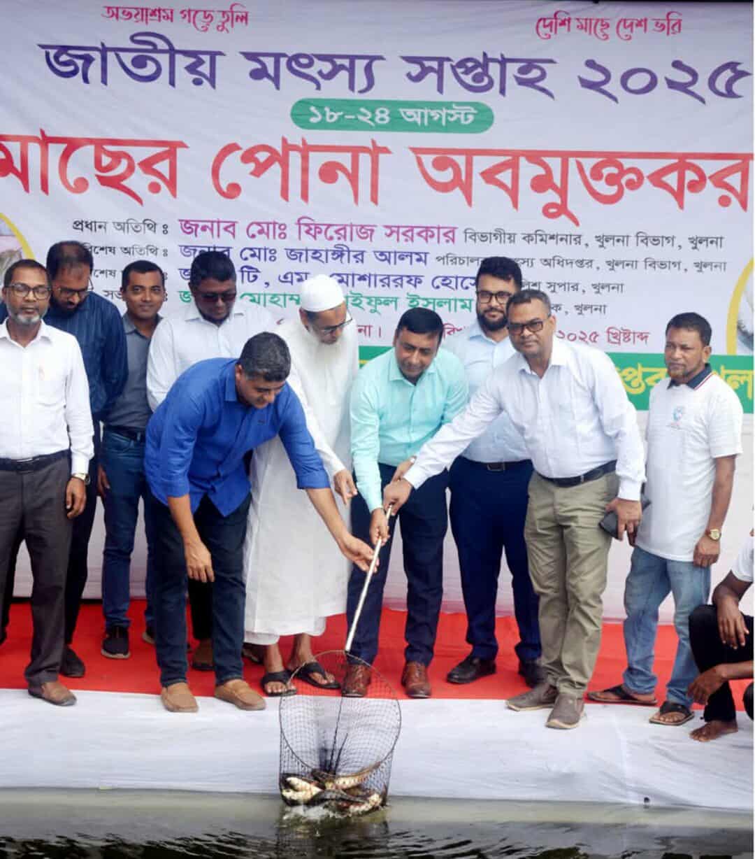 ‘অভয়াশ্রম গড়ে তুলি, দেশি মাছে দেশ ভরি’ এই প্রতিপাদ্য নিয়ে জাতীয় মৎস্য সপ্তাহের উদ্বোধন, আলোচনা সভা ও পুরস্কার বিতরণ অনুষ্ঠান আজ ১৮ আগষ্ট (সোমবার) সকালে খুলনা জেলা প্রশাসকের সম্মেলনকক্ষে অনুষ্ঠিত হয়। অনুষ্ঠানে প্রধান অতিথি ছিলেন খুলনার অতিরিক্ত বিভাগীয় কমিশনার (সার্বিক) মোঃ হুসাইন শওকত। অনুষ্ঠানে প্রধান অতিথি বলেন, আমাদের শারীরিক ও মানসিক বিকাশে মাছ গুরুত্বপূর্ণ ভূমিকা পালন করে। দেশে মাছের উৎপাদন বৃদ্ধির ফলে মৎস্যজীবী ও মৎস্যচাষিদের আয় বৃদ্ধি পেয়েছে। দক্ষিণাঞ্চলে মাছ চাষের অনেক জায়গা খালি রয়েছে। পতিত এই জায়গাগুলো মাছ চাষের উপযোগী করতে পারলে মাছের উৎপাদন বৃদ্ধি পাবে এবং মাছের চাহিদা পূরণ হবে। তিনি আরও বলেন, মৎস্যখাত জাতীয় উন্নয়নে অবদান রেখে চলছে। মৎস্যচাষ মানুষের জীবনমান উন্নয়ন করতে পারে। পরিকল্পিতভাবে মাছচাষ করলে অল্প জায়গায় অধিক উৎপাদন নিশ্চিত করা যায়। খুলনার জেলা প্রশাসক মোহাম্মদ সাইফুল ইসলামের সভাপতিত্বে অনুষ্ঠানে বিশেষ অতিথি ছিলেন মৎস্য অধিদপ্তরের বিভাগীয় কার্যালয়ের পরিচালক মোঃ জাহাঙ্গীর আলম। স্বাগত বক্তৃতা করেন জেলা মৎস্য কর্মকর্তা মো: বদরুজ্জামান। অনুষ্ঠানে খুলনা প্রেসক্লাবের সদস্য সচিব রফিউল ইসলাম টুটুল, চিংড়িচাষি মোঃ আবু হাসান সরদার প্রমুখ বক্তৃতা করেন। এতে সরকারি-বেসরকারি দপ্তরের কর্মকর্তা, মৎস্যচাষি, মৎস্যজীবী ও মাছ রপ্তানিকারক প্রতিষ্ঠানের প্রতিনিধি ও ব্যবসায়ী সমিতির প্রতিনিধিরা উপস্থিত ছিলেন। খুলনা জেলা প্রশাসন ও মৎস্য অধিদপ্তর যৌথভাবে এ অনুষ্ঠানের আয়োজন করে। অনুষ্ঠানে প্রধান অতিথি জেলার ছয়জন সফল মৎস্যচাষি, ব্যক্তি, উদ্যোক্তা ও প্রতিষ্ঠানকে সম্মাননা ক্রেস্ট প্রদান করেন।